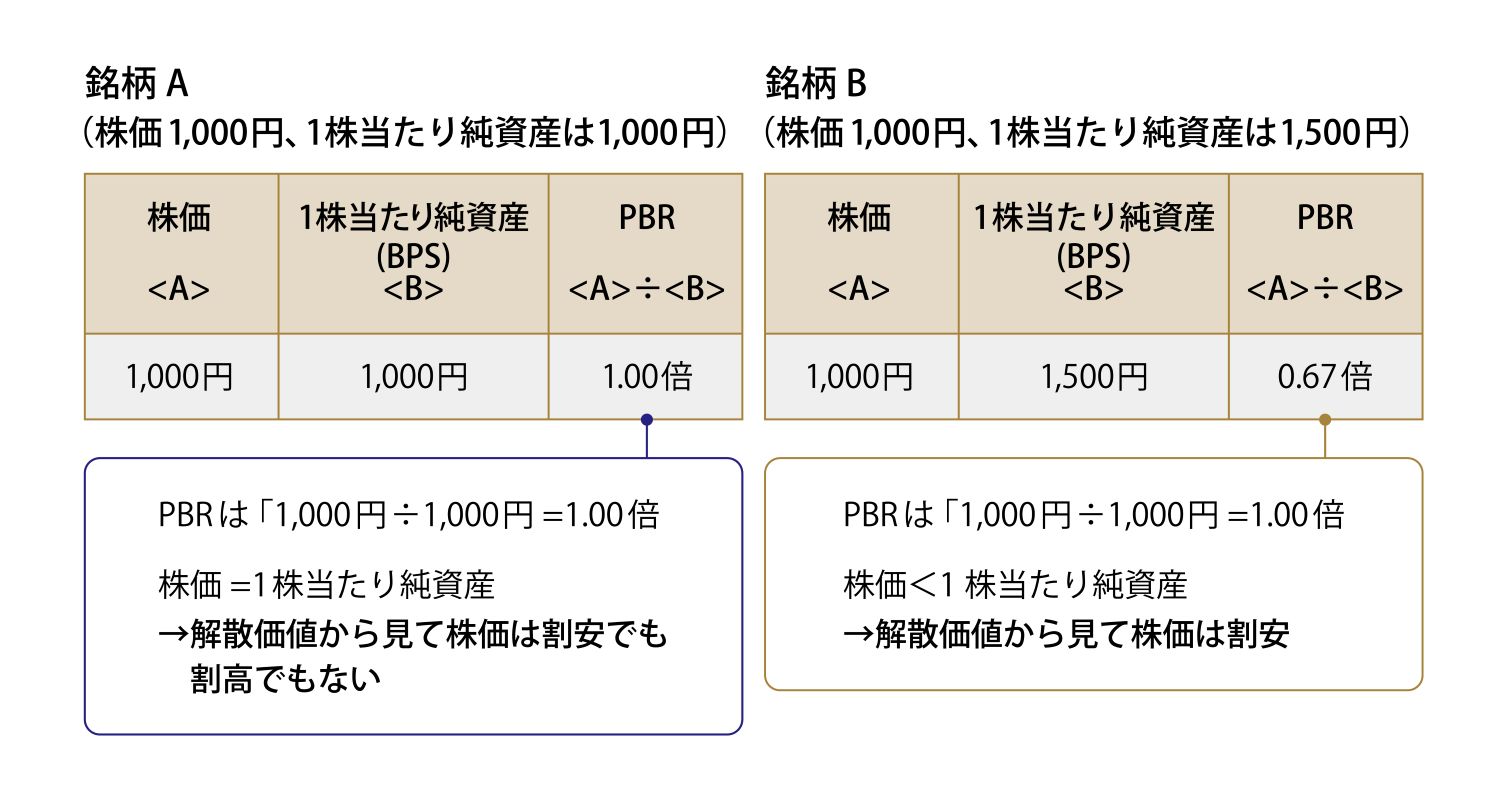 株価1,000円、1株当たり純資産が1,500円である銘柄BのPBRは「株価1,000円÷1株当たり純資産1,500円=0.67倍」です。PBRが1倍未満のとき、株価が1株当たり純資産よりも安いことを示すため、株価は割安と判断されます。
