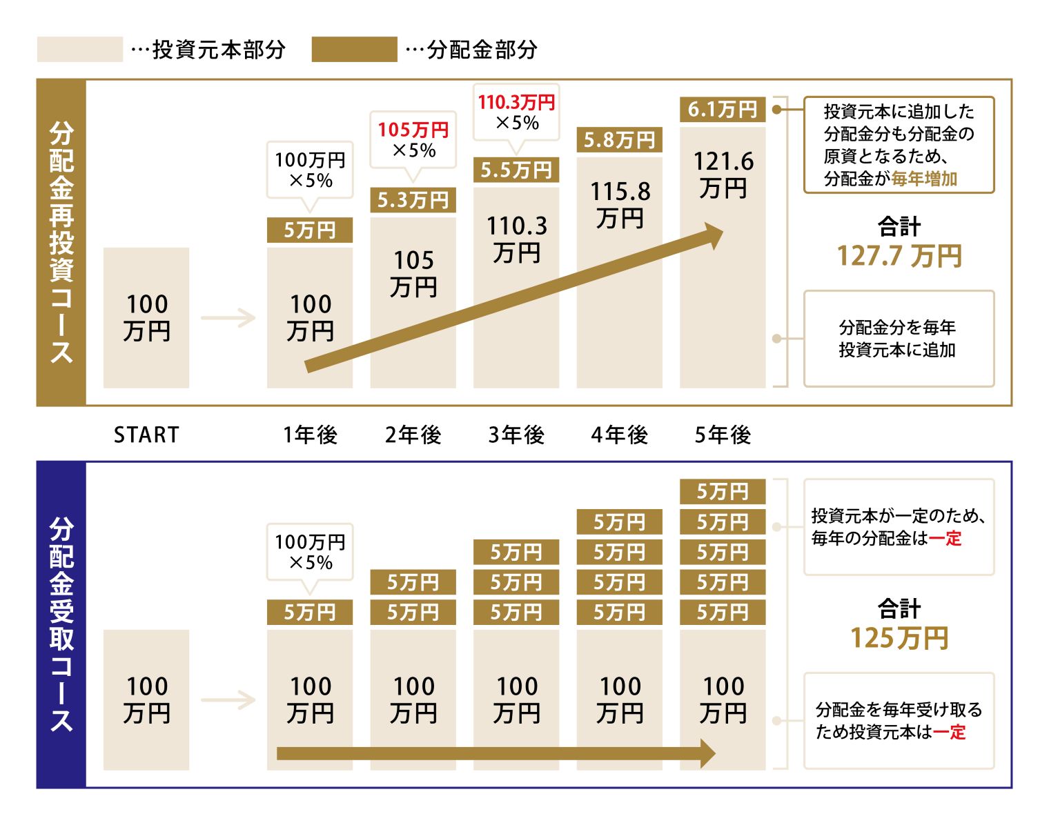 複利効果とは、利益を元本に加えて再投資し、利益が更なる利益を生む仕組みのことです。再投資コースを選ぶメリットの一つがこの複利効果にあります。